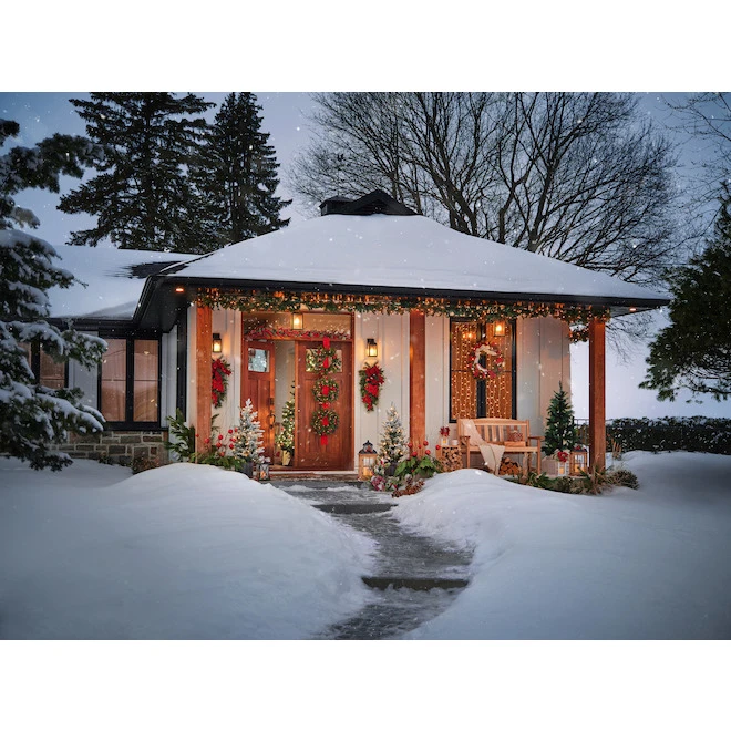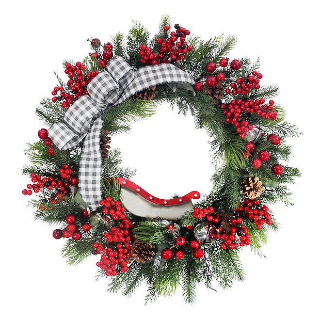 Un mélange de pin, de cèdre et de fausses feuilles est décoré de pommes de pin naturelles, de fausses baies et de clochettes argentées. Des noeuds de ruban de Noël à carreaux de buffle blancs et gris sont ajoutés à la couronne de manière décentrée et organique. Un traîneau rouge et argenté se trouve au bas de la couronne, offrant un accueil joyeux. 25 lumières DEL blanc chaud éclairent la couronne d’une lueur constante. La couronne nécessite 3 piles AA (non incluses) et comprend des options de marche/arrêt/temporisateur (6 heures de marche/18 heures d’arrêt). Utilisation en intérieur et en extérieur protégé. Couronne décorative éclairée de 30 pouces avec des éléments inspirés de la nature, un ruban à tartan et un traîneau pour une déclaration festive de NoëlUn mélange de base de pin, de cèdre et de fausses feuilles en PE est décoré de pommes de pin naturelles, de fausses baies et de clochettes argentéesDes boucles de ruban de Noël à tartan blanc et gris sont ajoutées à la couronne de manière décentrée et organiqueUn traîneau rouge et argenté trône au bas de la couronne, offrant un accueil joyeux25 DEL blanc chaud éclairent la couronne d’une lueur constanteLa couronne nécessite 3 piles AA (non incluses) et comprend des options de marche/arrêt/minuterie (6 heures de marche/18 heures d’arrêt)Idéal sur une porte, comme décoration murale, sur un miroir ou au-dessus d’un manteau de cheminéeUtilisation à l’intérieur et à l’extérieur sous abri