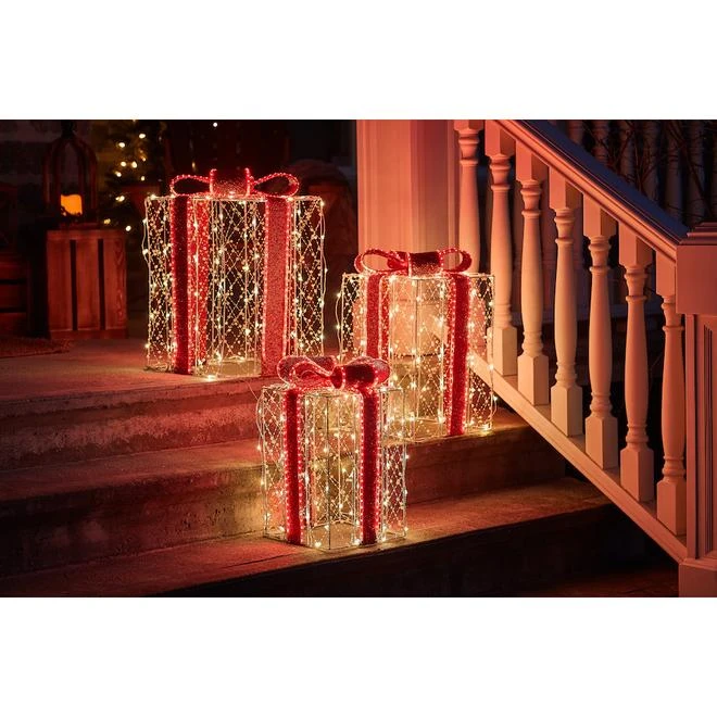 Ajoutez cette décoration festive à votre décor des Fêtes! Les 3 boîtes-cadeaux sont illuminées de lumières DEL blanc chaud. Déjà assemblé. Pas besoin d’assemblageÉclairage micro et SMD