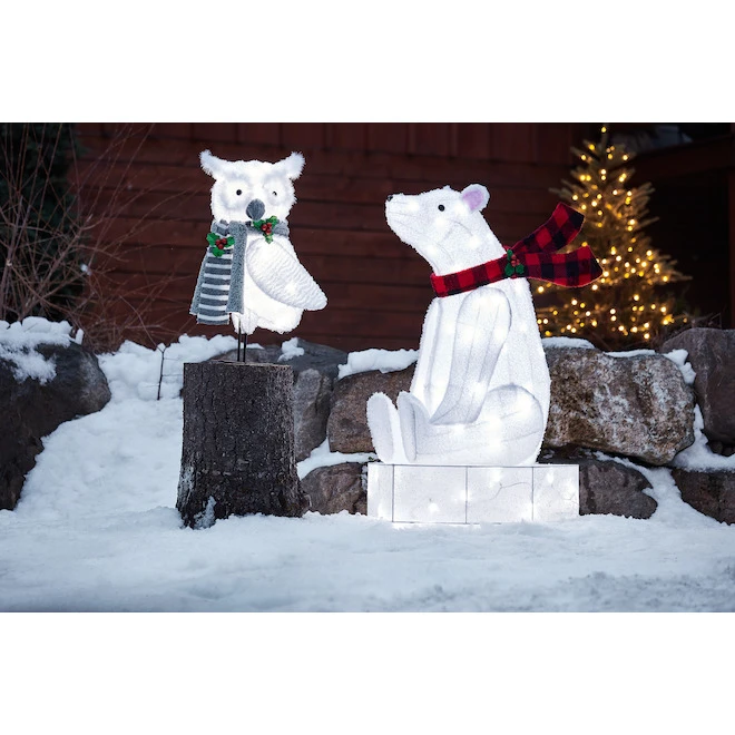 Ce hibou élégant peut être utilisé dans de nombreux endroits pour rehausser vos décorations des fêtes. Il est l’ajout parfait aux décorations d’inspiration boisées ou tout autre décor hivernal. Avec son foulard gris rayé, ses 80 lumières DEL blanc froid et un fil d’alimentation de 72 pouces nous sommes certains que vous apprécierez cette décoration d’extérieur résistante aux intempéries toute la saison. Résistant aux intempériesIlluminé par 80 ampoules DEL blanc froidÉcharpe rayée griseCadre en métal revêtu d’un tissu pelucheuxAmpoules et fusibles de rechange inclusLe fil conducteur a une longueur de 72 poucesUtilisation à l’intérieur et à l’extérieurPiquets en métal pour la pelouse inclus