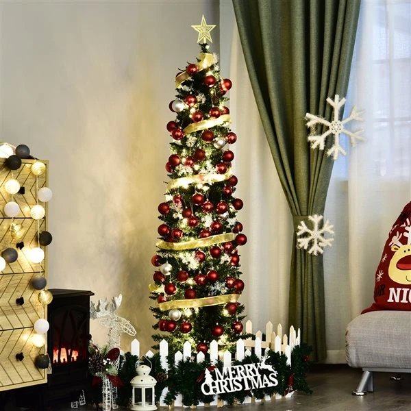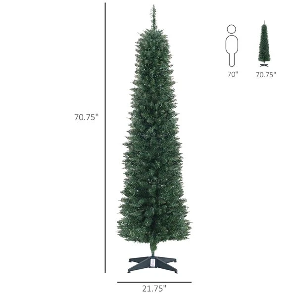 Cette saison des fêtes, passez plus de temps à célébrer et moins de temps à entretenir et à nettoyer avec cet arbre de noël artificiel pré-éclairé de 6 pi de HomCom. Ce modèle mince de style crayon est doté de 200 lumières DEL blanc chaud intégrées pour créer magnifique effet étincelant pour donner une sensation authentique des Fêtes.Arbre mince de style crayonDoté de 200 lumières LED intégréesDoté de 390 branchesLes branches articulées facilitent le démontage et le rangementSe sépare en trois sections pour un rangement compact