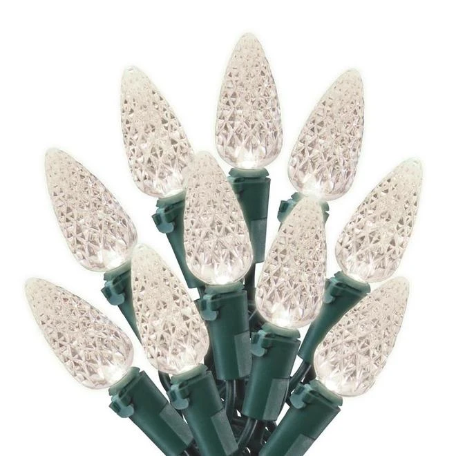 Jeu de 70 lumières DEL C6 blanc chaud sur fil vert se branchant bout à bout. Espacement de 3,5″ (8,89 cm) avec longueur totale illuminée de 15,5′ (4,72 m). Certifié CUL/Energy Star. Garantie de 3 ans. Conçu pour durerÉcoénergétiqueRaccordement finalFil vert