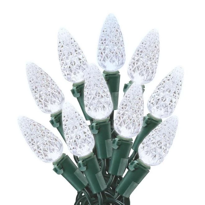 Jeu de 70 lumières DEL C6 blanc pur sur fil vert se branchant bout à bout. Espacement de 3,5″ (8,89 cm) avec longueur totale illuminée de 15,5′ (4,72 m). Certifié CUL/Energy Star. Garantie de 3 ans. Conçu pour durerÉcoénergétiqueRaccordement finalFil vert