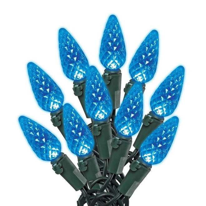 Jeu de 70 lumières DEL C6 bleues sur fil vert se branchant bout à bout. Espacement de 3,5″ (8,89 cm) avec longueur totale illuminée de 15,5′ (4,72 m). Certifié CUL/Energy Star. Garantie de 3 ans. Conçu pour durerÉcoénergétiqueRaccordement finalFil vert